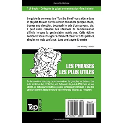Guide de conversation Français-Arabe égyptien et dictionnaire concis de 1500 motsLa collection de guides de conversation "Tout ira bien!", publiée par T&P Books, est conçue pour les gens qui voyagent par affaire ou par plaisir. Les guides contiennent l'essentiel pour la communication de base. Il s'agit d'une série indispensable de phrases pour "survivre" à l'étranger. Certains des sujets inclus dans ce guide de conversation sont: demander des directions, les affiches, les transports, acheter un billet, à l'hôtel, au restaurant, le shopping, les salutations, les connaissances, la communication, la reconnaissance, les problèmes de santé, les excuses, les adieux et plus. Ce livre contient beaucoup de phrases qui ont été groupées par thèmes. Une autre section du livre contient un petit dictionnaire de plus de 1500 mots les plus utilisés. Le dictionnaire inclut beaucoup de termes gastronomiques et peut être utile lorsque vous faites le marché ou commandez des plats au restaurant. Emmenez avec vous un guide de conversation "Tout ira bien!" sur la route et vous aurez un compagnon de voyage irremplaçable qui vous aidera à vous sortir de toutes les situations et vous enseignera à ne pas avoir peur de parler aux étrangers.