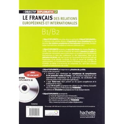 Structure :12 unités, comprenant chacune :3 situations pour développer les compétences de compréhension et de production à l'oral comme à l'écrit 1 page de découverte des "savoir-être" dans une perspective interculturelle1 page Infos sur les institutions européennes et internationales, les villes européennes et les médias de la Francophonie, en partenariat avec TV5 monde 1 page Testez-vous pour l'évaluation et la préparation au TCF relations internationales du CIEPDescriptif :Objectif Diplomatie 2 (B1/B2) est une méthode intensive pour un public d'adultes débutants. Il permet l'apprentissage du français dans le contexte des relations européennes et internationales. L'axe est mis su le dialogue entre les cultures.Cette méthode couvre, en 120 à 150 heures, les niveaux B1 et B2 du CECR. L’accent est mis sur l’argumentation et les stratégies concrètes de communication.