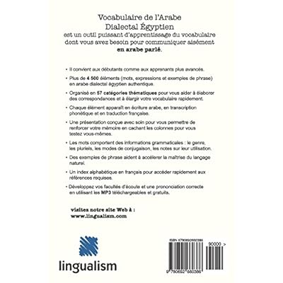 Le Vocabulaire de l’Arabe Dialectal Egyptien est un outil puissant d’apprentissage du vocabulaire dont vous avez besoin pour communiquer aisément en arabe parlé. Il convient aux débutants comme aux apprenants plus avancés. Plus de 4 500 éléments (mots, expressions, et exemples de phrase) en Arabe Dialectal Egyptien authentique. Organisé en 57 catégories thématiques pour vous aider à élaborer des correspondances et à élargir votre vocabulaire rapidement. Chaque élément apparaît en écriture arabe, en transcription phonétique et en traduction française. Une présentation conçue avec soin pour vous permettre de renforcer votre mémoire en cachant les colonnes pour vous testez vous-mêmes. Les mots comportent des informations grammaticales : le genre, les pluriels, les modes de conjugaison, les notes sur leur utilisation. Des exemples de phrase aident à accélérer la maîtrise du langage naturel. Un index alphabétique en français pour accéder rapidement aux références requises. Développez vos facultés d’écoute et une prononciation correcte en utilisant les MP3 téléchargeables et gratuits.